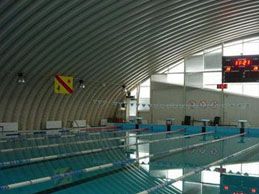 В бескаркасном сооружении может быть оборудован практически любой спортивный комплекс, за исключением разве что футбольного поля. Это может быть плавательный бассейн, каток, баскетбольная или волейбольная площадки, тренажерный зал, фитнес центр и многое другое. Такая конструкция может быть оборудована всеми необходимыми коммуникациями, такими как водоснабжение, приточно-вытяжная вентиляция, отопление, система кондиционирования и общая электрификация. Монтаж ангаров бескаркасного типа никак не ограничивает возможности планировки и отделки помещения.